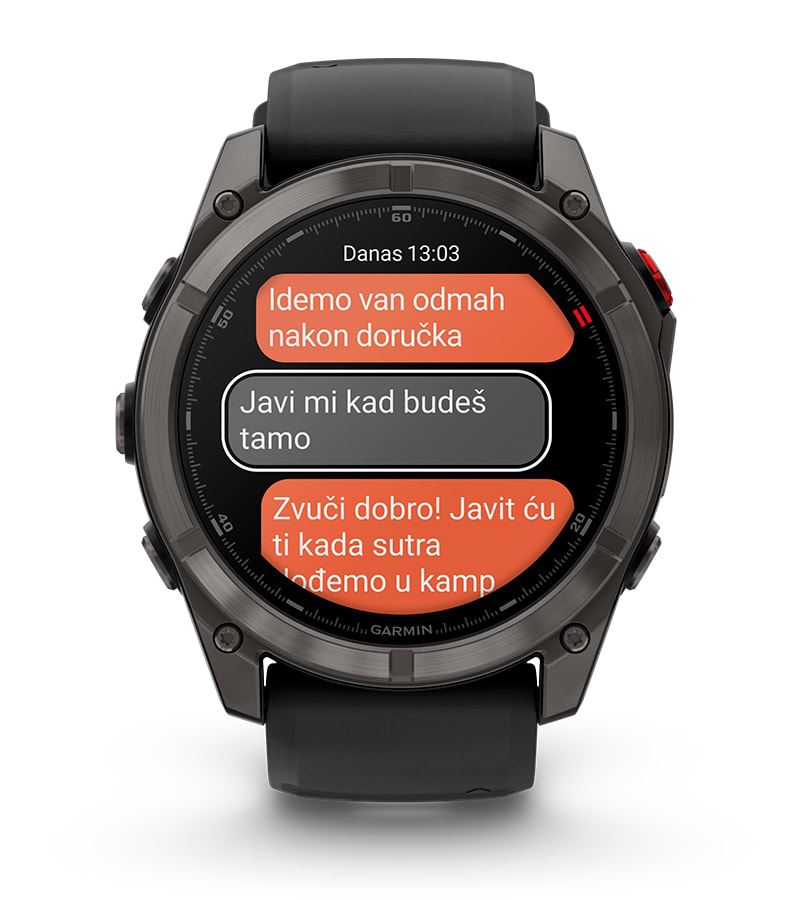 Poruke možete deliti sa drugim korisnicima aplikacije Garmin Messenger direktno sa sata, putem satelitske ili LTE veze. Aplikacija će se automatski sinhronizovati sa vašim kontaktima nakon što sat uparite sa pametnim telefonom.